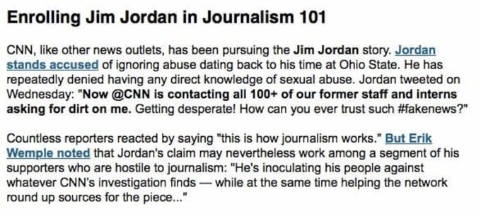 I like how Jim Jordan said he had no direct knowledge. (I wonder him much indirect knowledge he had???) He also said once no one made am official complaint. Sad!!! https://t.co/2mTFFraH25 (via Twitter http://twitter.com/VickieDavis/status/1017311452951138304)